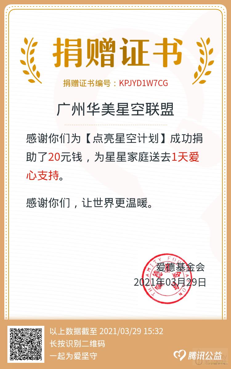 3月30日-4月2日,包含广州华美在内的333支爱心战队集结腾讯公益,发起爱心募捐,滴水汇聚成海,莹莹星火一起点亮星空。参与公益,有你有我。3月30日起,腾讯公益爱心募捐窗口面向全社会开放。凡是募捐者,都将被授予“公益星使”的称号,以及获赠公益感谢礼1份。