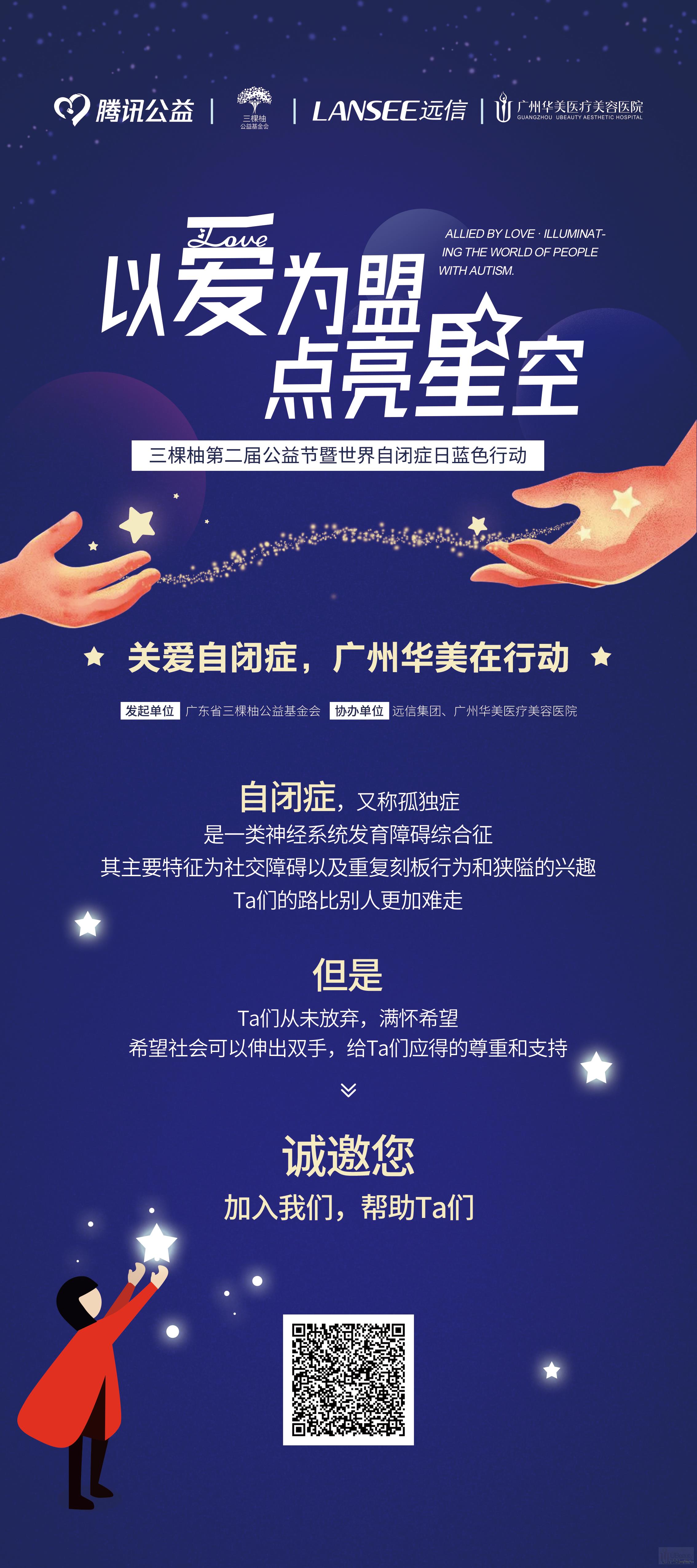 以爱为盟·点亮星空,广州华美成立27周年,长久以来致力于公益行动,本次公益活动,广州华美毅然加入《三棵柚第二届公益节暨世界自闭症日蓝色行动》,成为“星盟”一份子,为自闭症谱系障碍为主的群体提供帮扶救助。