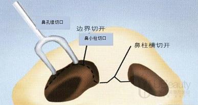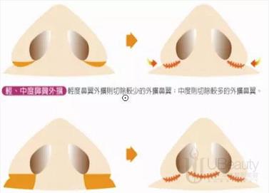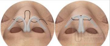 还有一种就是在口内做切口(不留疤),在鼻翼两端埋线,再将线收紧,鼻翼就变窄了,这种方法适用于轻度的鼻翼肥大缩小,但术后大笑时会有紧绷的感觉。